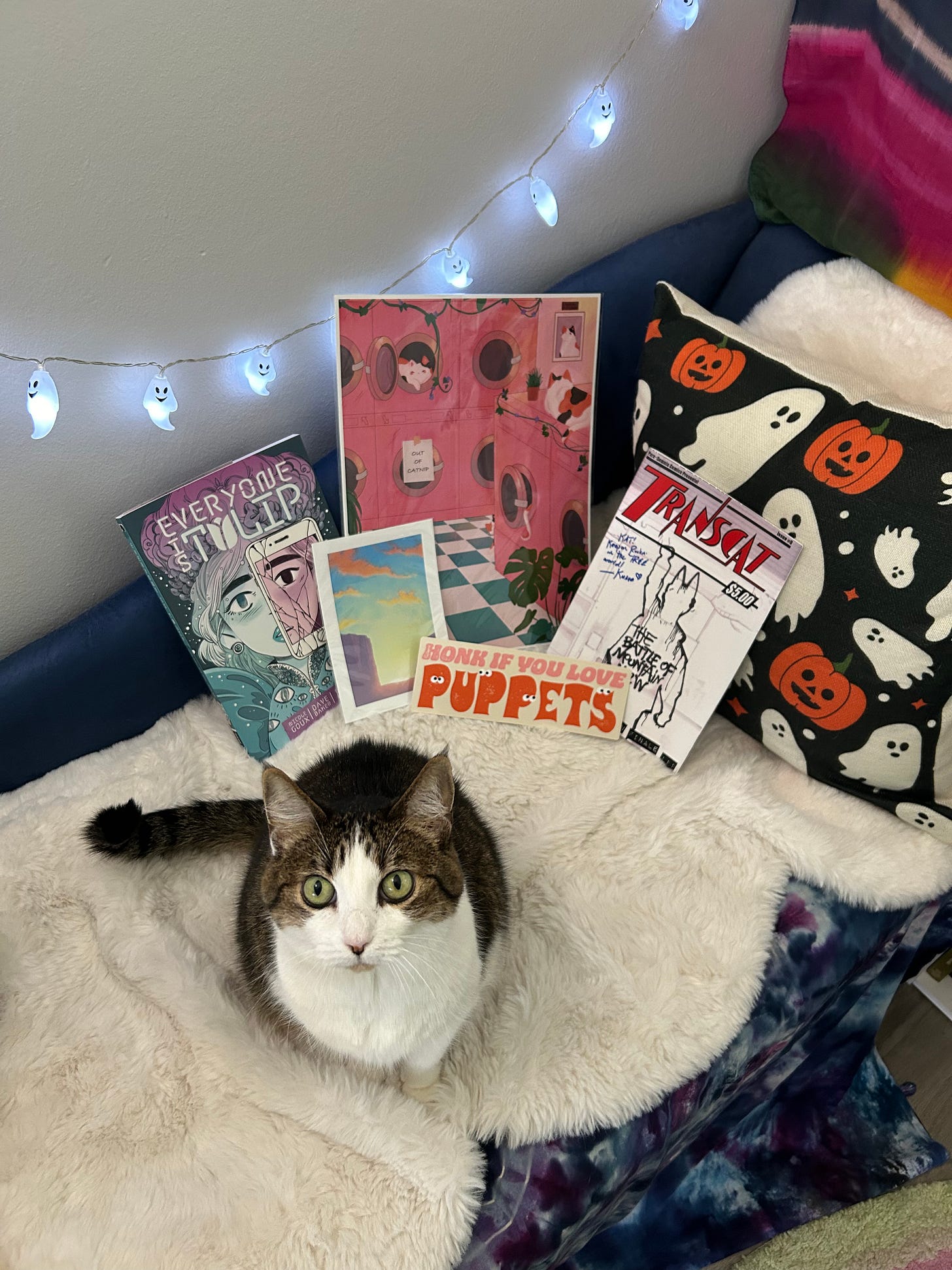 Image description. Two art prints, a sticker, and two comics are propped up on a couch. Bug, the cat, sits in front of them looking up into the camera. Ghost string lights hang in the background. End of image description.
