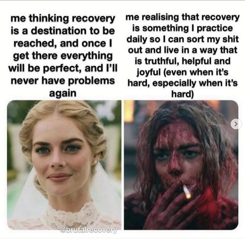 Image description: A picture of a clean blonde woman with the text me thinking recovery is a destination to be reached, and once I get there everything will be perfect, and I’ll never have problems again. Next to a picture of the same woman covered in blood and smoking a cigarette with the text me realizing that recovery is something I practice daily so I can sort my shit out and live in a way that is truthful, helpful and joyful, even when it’s hard, especially when it’s hard. End of image description.